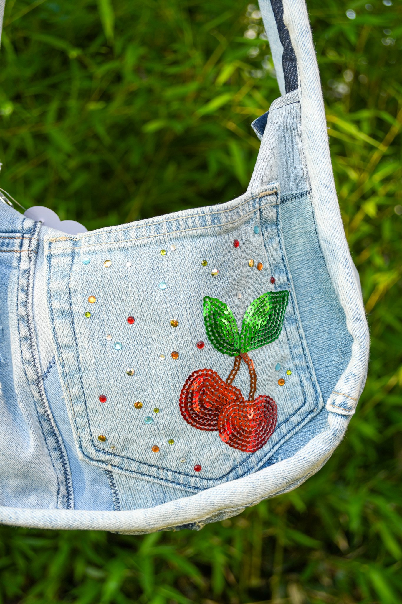 Patchwork denim bag made with a variety of upcycled denim. Lined with 100% cotton denim. Trimmed with variety of upcycled denim. Decorated with iron on gems and appliques.