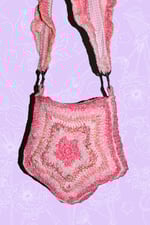 Handmade crochet dreamy star bag with a variety of pink, yellow & orange acrylic, wool, polyester and metallic fiber yarns. Lined with 100% cotton pink gingham fabric.