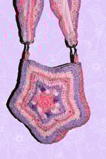 Handmade crochet dreamy star bag with a variety of pink & purple acrylic, wool, polyester and metallic fiber yarns. Lined with 100% cotton pink gingham fabric.
