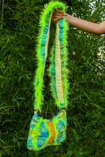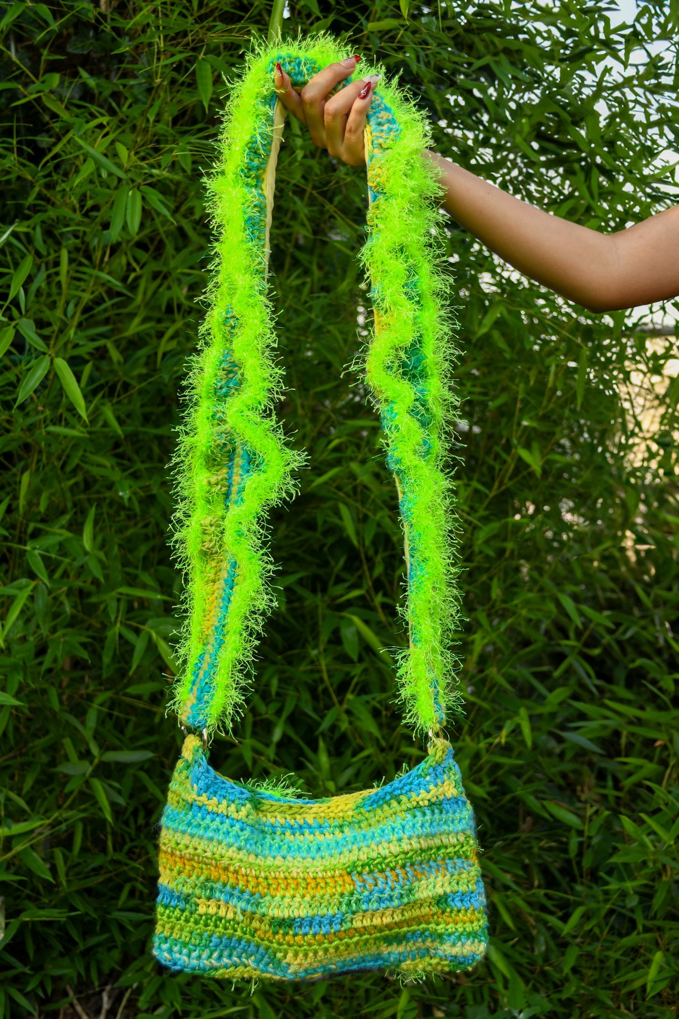 Handmade crochet with love. Lined with 100% cotton yellow denim. Made with variety of yarns, 100% acrylic, 90% polyester, 10% lurex.