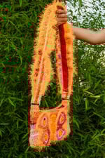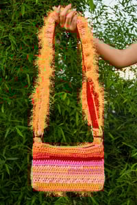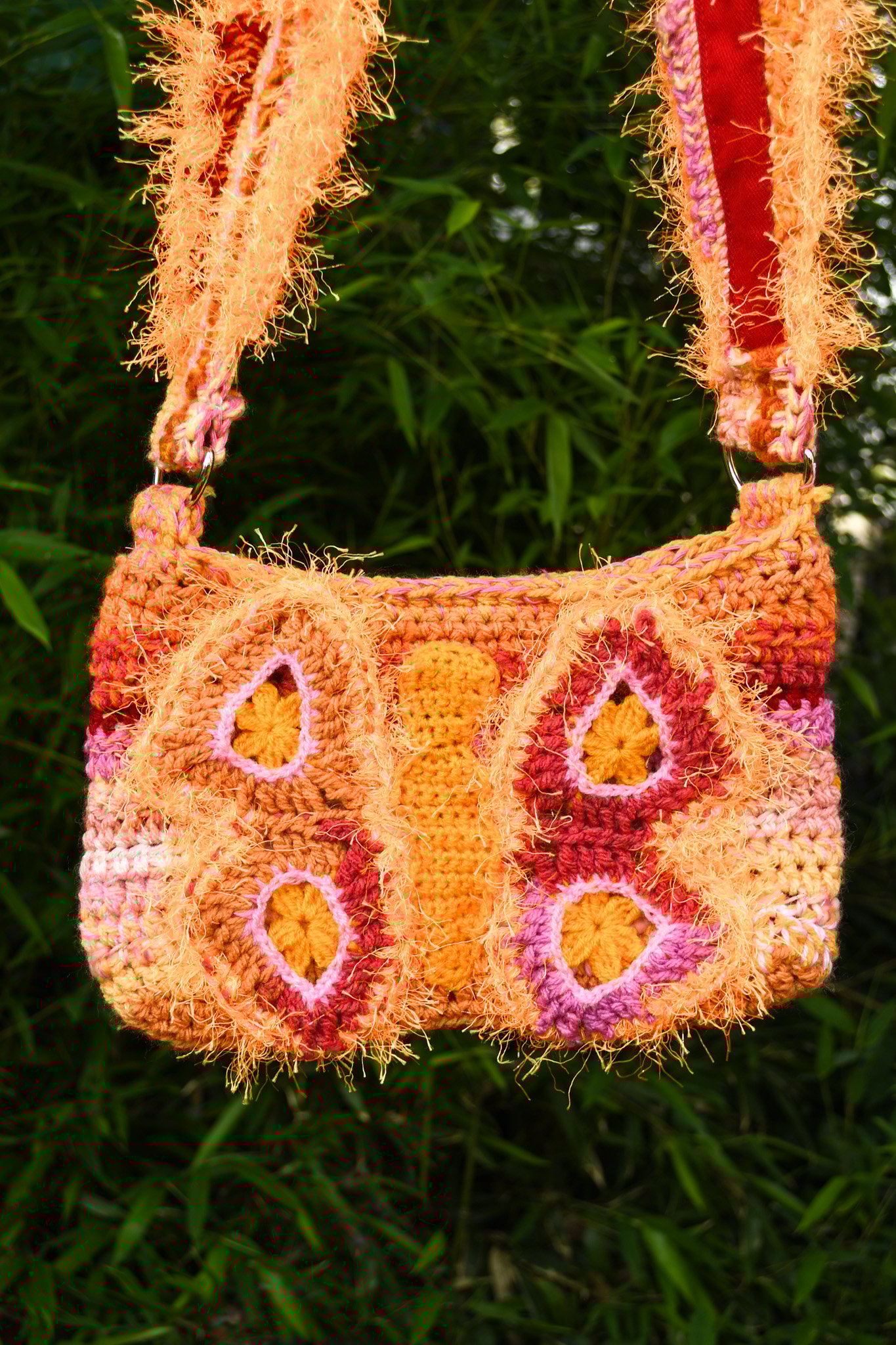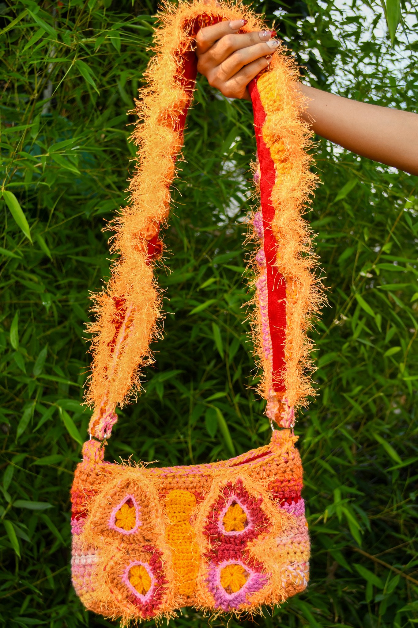 Handmade crochet with love. Lined with 100% cotton red denim. Made with variety of yarns, 100% acrylic, 90% polyester, 10% lurex.