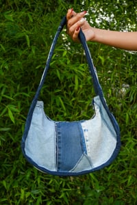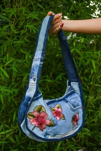 Patchwork denim bag made with a variety of upcycled denim. Lined with 100% cotton denim. Trimmed with variety of upcycled denim. Decorated with iron on gems and appliques.